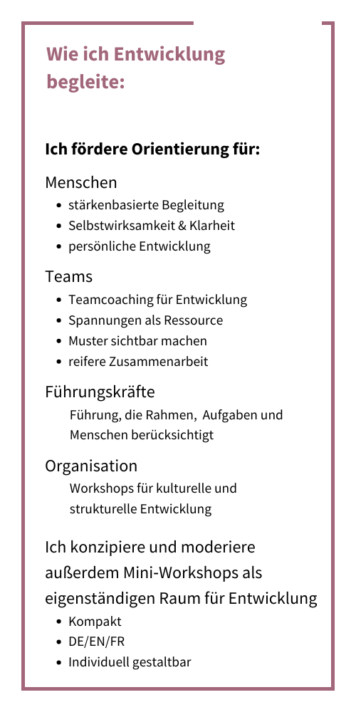Aus dieser Erfahrung heraus gestalte ich Formate, die Entwicklung ermöglichen.
