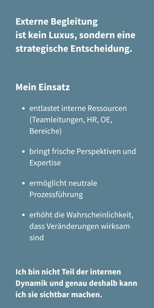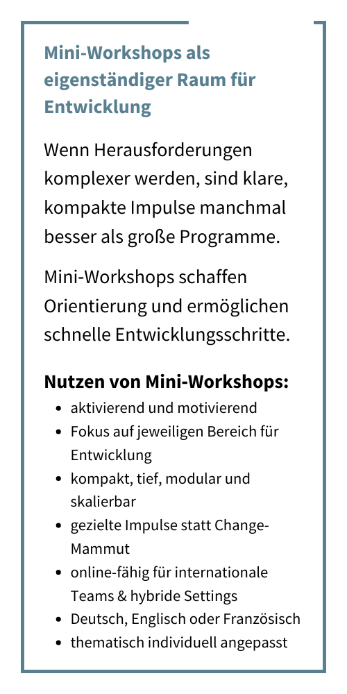 Die beschriebenen Wirkungen und Nutzen entstehen im Zusammenspiel von Kontext, Beteiligten und Prozessgestaltung. Sie sind emergent und können nicht garantiert werden. Dieses Angebot versteht sich als prozessbegleitende Intervention, nicht als Erfolgsversprechen im rechtlichen Sinn. Die Inhalte dieser Seite dienen der Information und Inspiration. Sie ersetzen keine individuelle Beratung und stellen keine rechtliche, wirtschaftliche oder therapeutische Empfehlung dar.