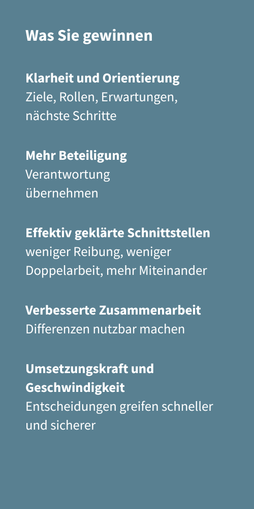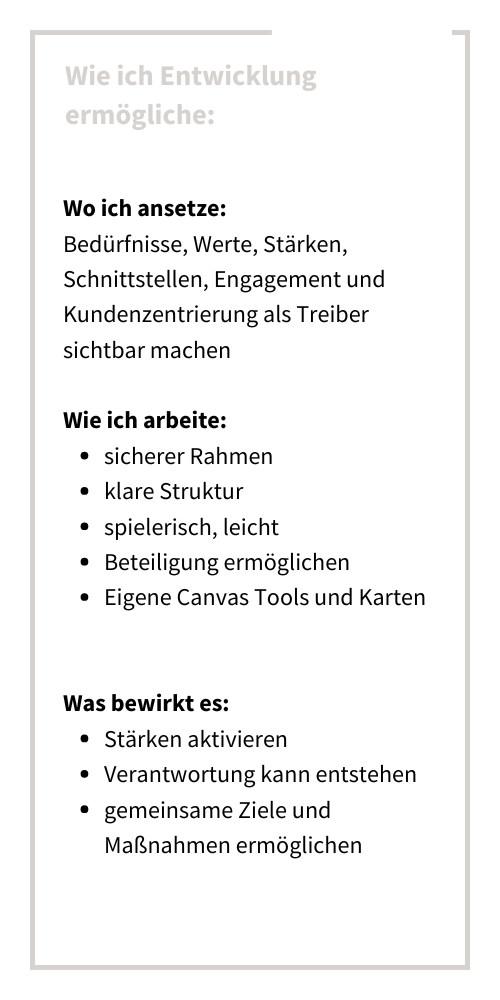 Entwicklung entsteht dort, wo klar ist, was Menschen und Bereiche voneinander brauchen, welche Prinzipien gelten, und welche Stärken jeder einbringen kann