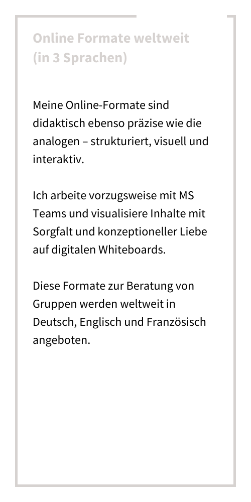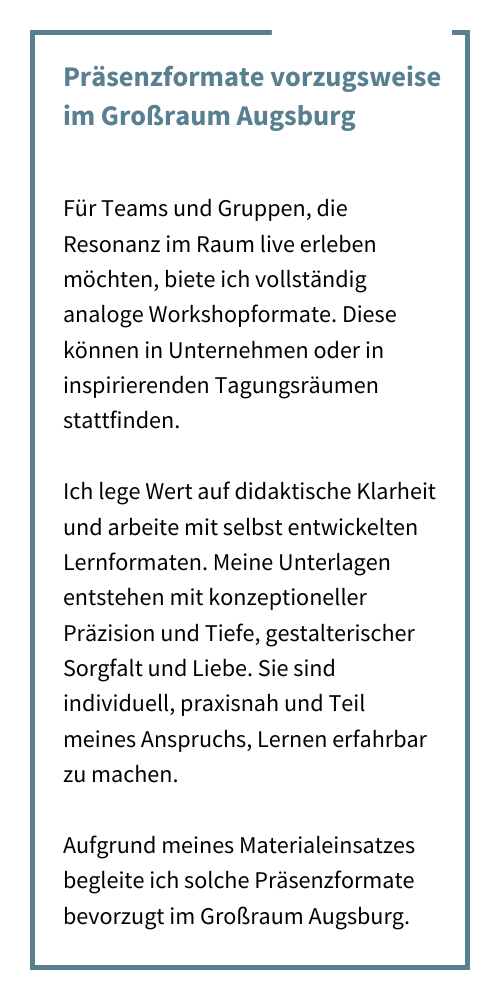 Präsenzformate biete ich vorzugsweise im Großraum Augsburg an, Online Formate, zum Beispiel auch für hybride internationale Teams, können auf Deutsch, Englisch oder Französisch angeboten werden.