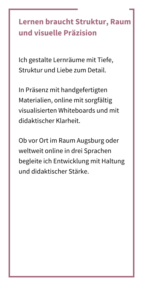 Ich lerne mit Begeisterung, reflektiere tief und entwickle Formate, die Wachstum ermöglichen.
