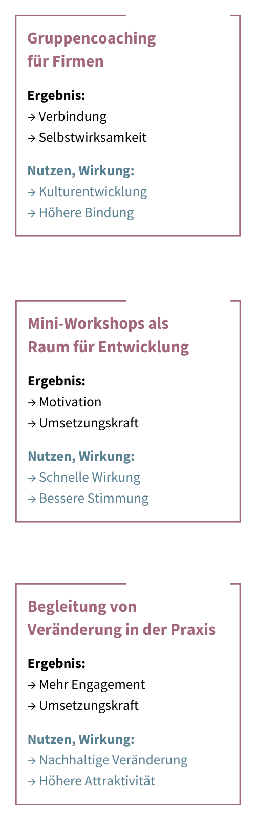 Die beschriebenen Wirkungen und Nutzen entstehen im Zusammenspiel von Kontext, Beteiligten und Prozessgestaltung. Sie sind emergent und können nicht garantiert werden. Dieses Angebot versteht sich als prozessbegleitende Intervention, nicht als Erfolgsversprechen im rechtlichen Sinn. Die Inhalte dieser Seite dienen der Information und Inspiration. Sie ersetzen keine individuelle Beratung und stellen keine rechtliche, wirtschaftliche oder therapeutische Empfehlung dar.