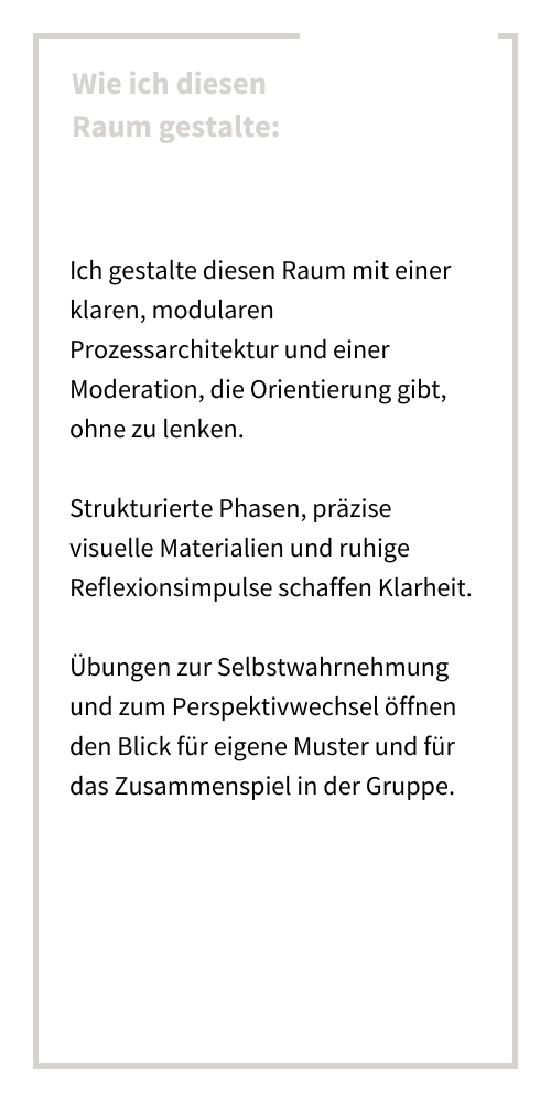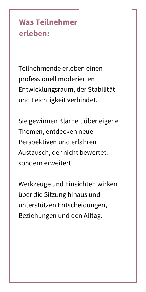 Die individuelle Tiefe ergibt sich aus der Bereitschaft der Teilnehmenden, persönliche Themen einzubringen. Ein Anspruch auf ein separates oder vertieftes Einzelgespräch besteht nicht, kann bei Bedarf jedoch zusätzlich gebucht werden.