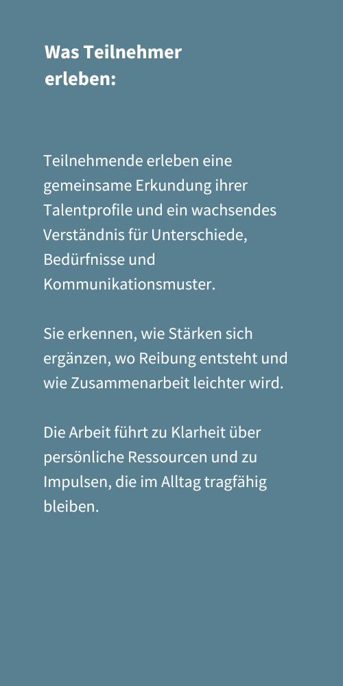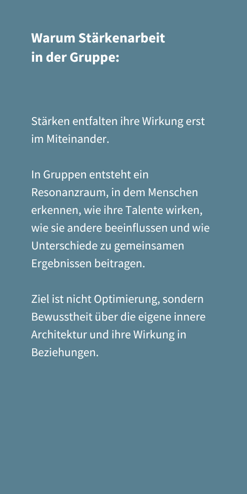Ein separates Einzelcoaching vorab ist nicht Bestandteil dieses Angebots. Die Besprechung des individuellen CliftonStrengths®‑Berichts erfolgt ausschließlich im Rahmen des Gruppencoachings und orientiert sich an den Grundsätzen der zertifizierten Stärkenarbeit. Der Bericht wird nicht online gezeigt oder weitergegeben; die Arbeit erfolgt mit eigenen methodischen Zugängen.