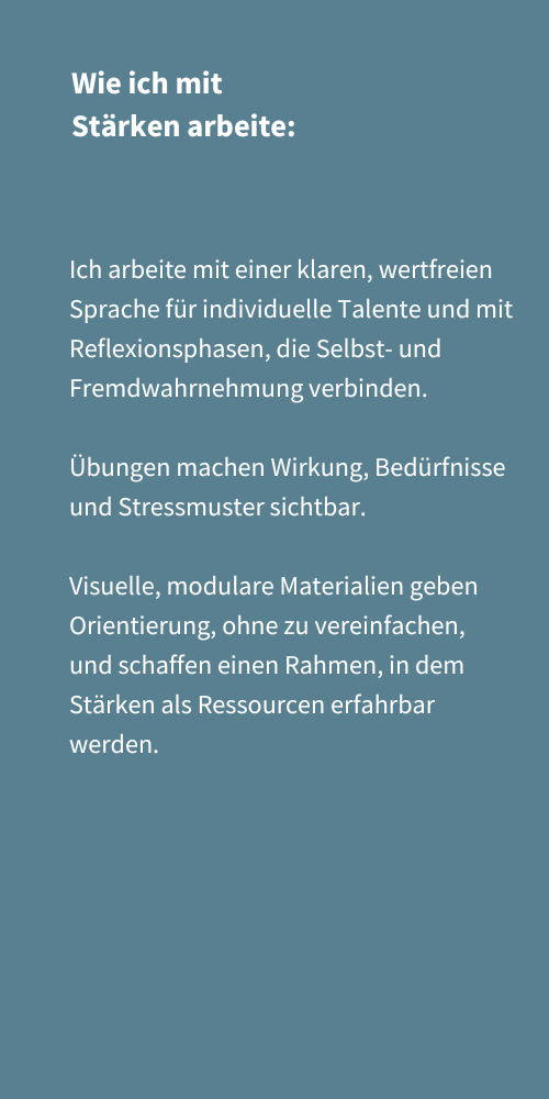 Alle Inhalte, Materialien und Beschreibungen auf dieser Webseite sowie in meinen Gruppencoachings sind eigenständig entwickelt und keine offiziellen Gallup‑Publikationen. Es werden keine geschützten Materialien, Grafiken oder Inhalte von Gallup verwendet. Die individuellen CliftonStrengths®‑Ergebnisse der Teilnehmenden dienen ausschließlich als Grundlage für mein eigenes Coaching‑Konzept für Gruppen. Dieses Angebot ist nicht mit Gallup verbunden.