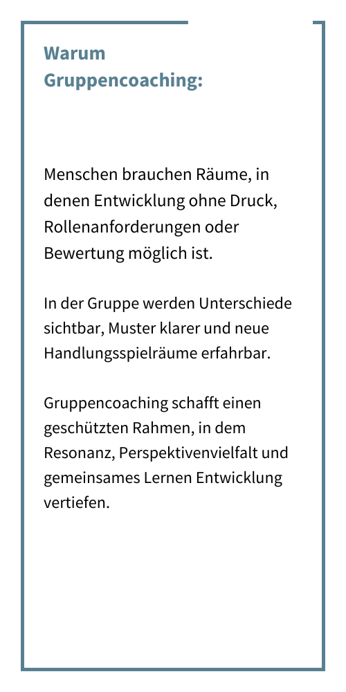 Einzelcoaching schafft Tiefe im persönlichen Prozess, während Gruppencoaching diese Tiefe um Perspektiven, Resonanz und gemeinsames Lernen erweitert. In der Gruppe entsteht ein Raum, in dem Unterschiede sichtbar werden, Muster klarer werden und Entwicklung durch Austausch, Spiegelung und Vielfalt an Erfahrungen gewinnt.