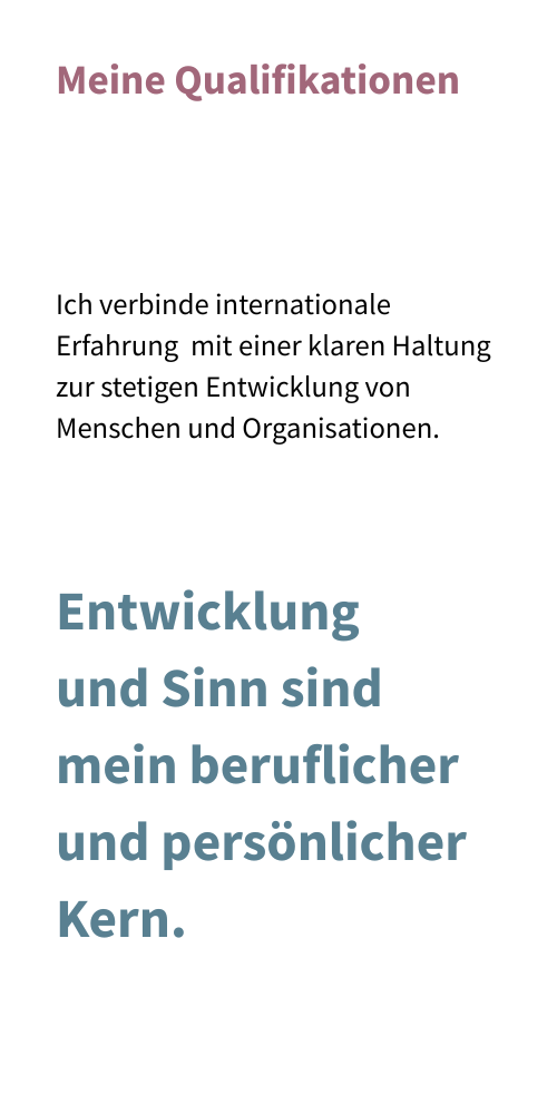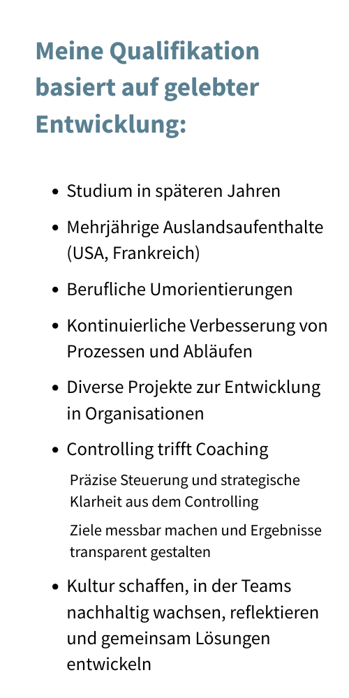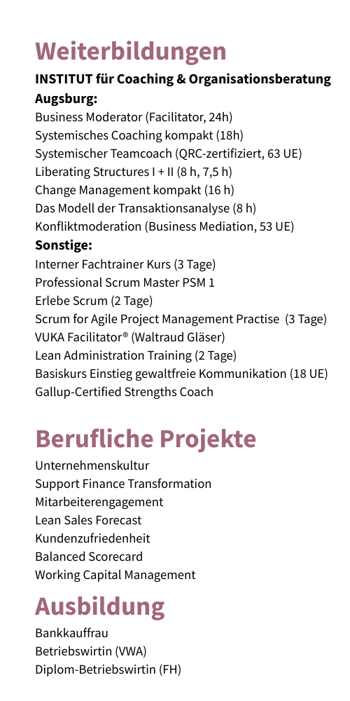 Ich bin beratende Betriebswirtin mit langjähriger operativer Erfahrung im Finanzbereich im globalen Konzernumfeld im In- und Ausland. Nebenberuflich selbständig und in Weiterbildung im Bereich Organisationsentwicklung